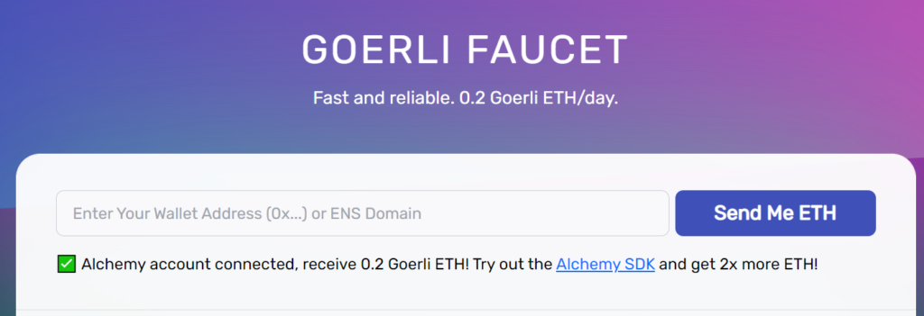 続いて、Goerliでテストネット用のトークンを受け取る。