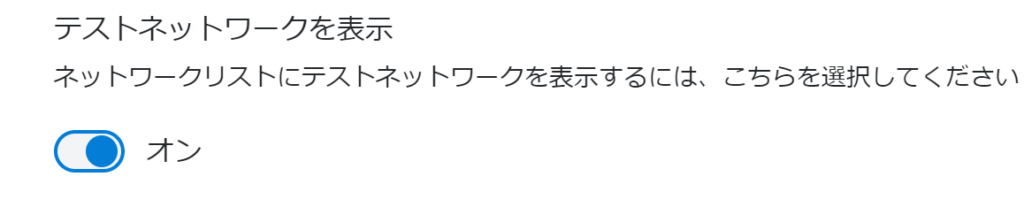 テストネットワーク表示がオフになっていたので、画像のようにオンに切り替え