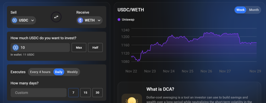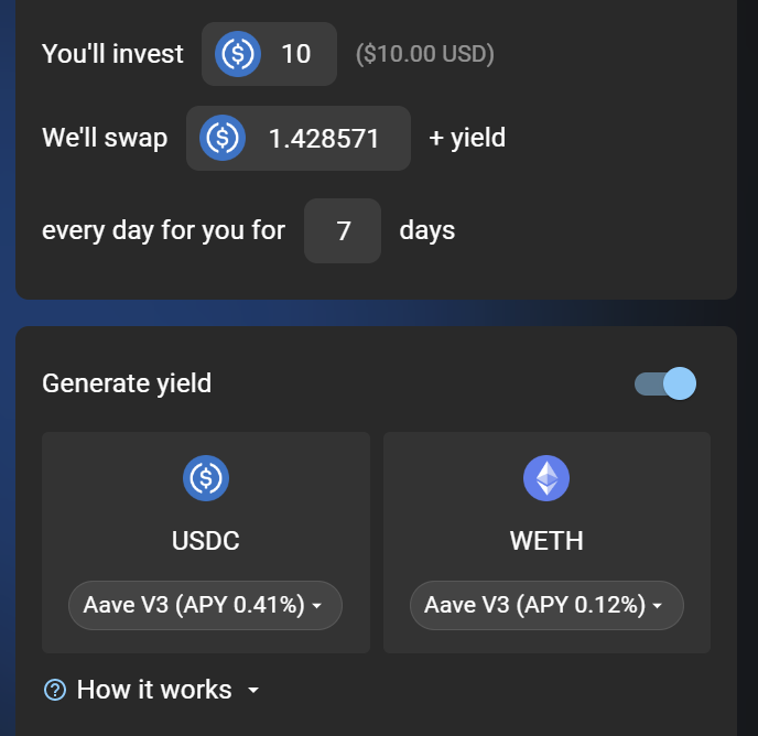 何(例:USDC)で何(例:ETH)を積み立てるのか、積み立てをする頻度、積み立てする期間の設定をすることができるのはもちろん、買い付け前の積み立ての原資(例:USDC)、買い付け後の積み立てた資産(例:ETH)をレンディングに出して利回りを稼いでくれる機能も付いています。