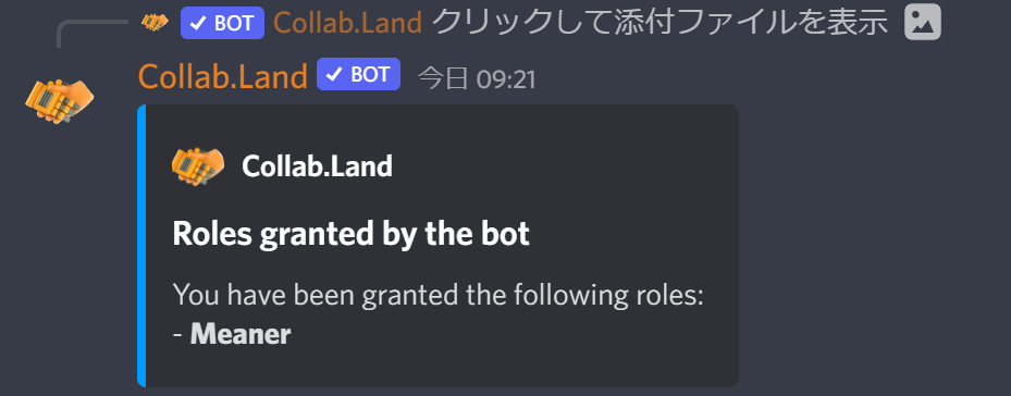 Verifyチャンネルで、Collab.Landによるウォレットの接続をすると、Meanerのロールがもらえました。