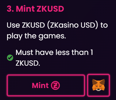 次に “Mint “をクリックして、ゲームをプレイするためのZKUSD(ZKasino USD)を鋳造してください。