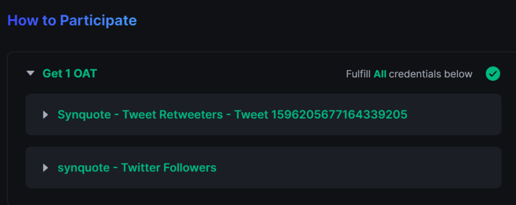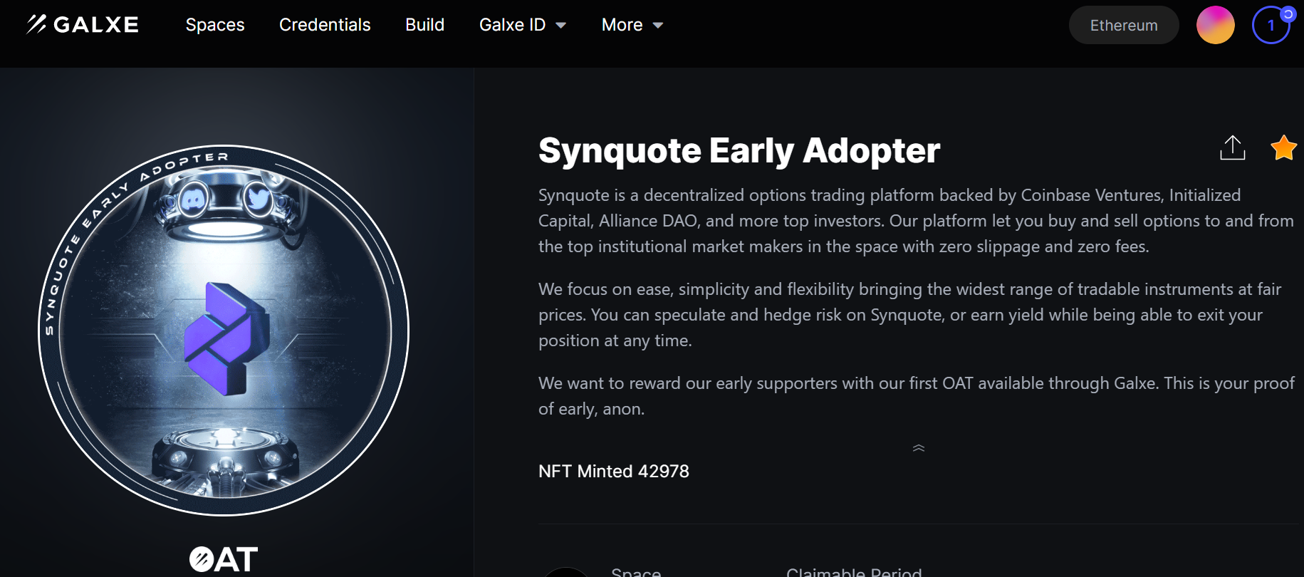 オプション取引プラットフォームのSynquoteが、12月25日まで限定でGalxeにてOATを配っている。